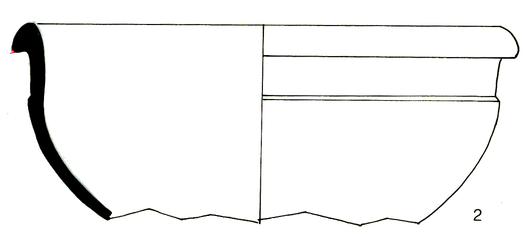 Partie supérieure d'une terrine hémisphérique ; lèvre ronde ; collerette sur le haut de la panse ;