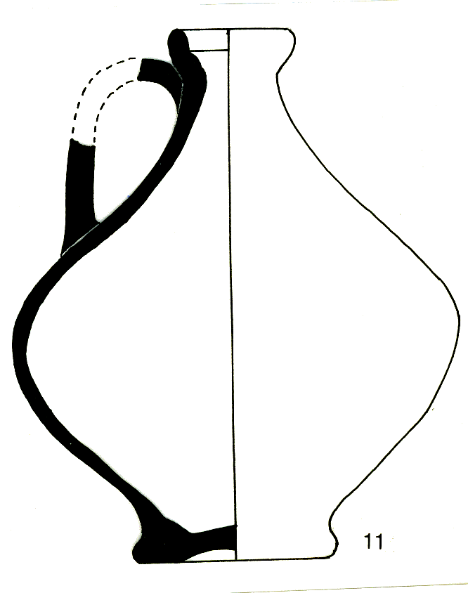base étirée puis élargie, assise concave ; anse s'attachant sur le haut du col et sur le haut de la panse ;