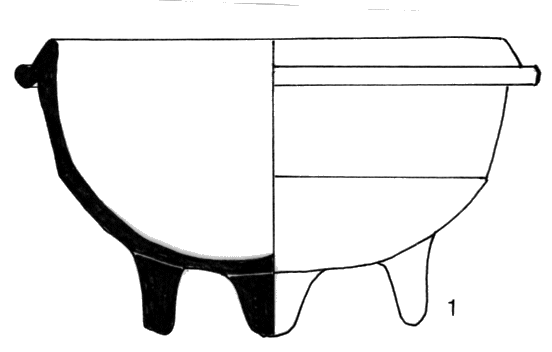 Marmite tripode de forme hémisphérique ; rebord triangulaire, lèvre concave ; pieds coniques verticaux ; céramique tournée, couleur brune en surface et sur les cassures ; inclusions grossières : quartz irrégulier abondant, mica ; surface avec revêtement micacé.