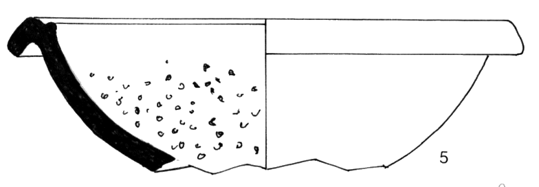 Mortier de forme hémisphérique ; lèvre ronde ; base étirée ; collerette s'attachant sur le haut de la panse ; céramique tournée, couleur rouge brique en surface et sur les cassures ; inclusions grossières : quartz irrégulier en proportion moyenne ; surface brute.