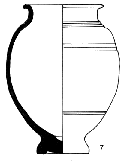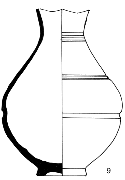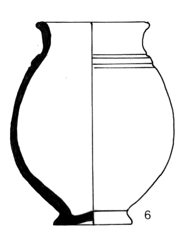 Pichet de forme sphérique ; encolure rentrante concave, pied en couronne bas aux parois divergentes rectilignes ; céramique tournée, couleur orangée en surface et sur les cassures ; inclusions fines : quartz peu visible, mica ; surface avec revêtement micacé. Sillons sur le milieu du col, le haut et le milieu de la panse.