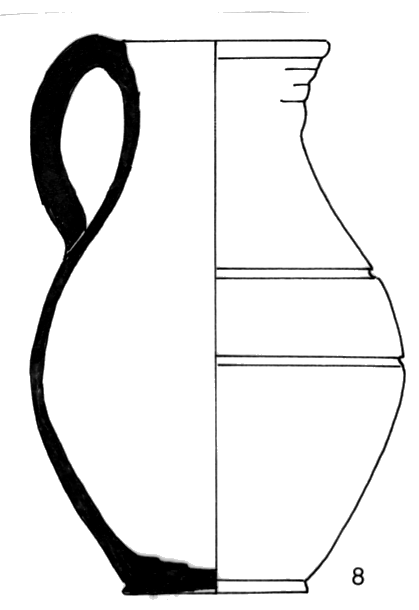 Pichet de forme elliptique étirée ; encolure verticale, concave, rebord en rouleau, lèvre ronde ; base étirée puis élargie, assise concave ; anse s'attachant sur la lèvre et sur la base du col ; céramique tournée, couleur orangée en surface et sur les cassures ; inclusions fines : quartz peu visible, mica ; surface avec revêtement micacé. Sillons sur le milieu et sur le haut de la panse.